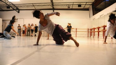 Trabajo en piso con una búsqueda influenciada por calidades de movimiento del hip hop, break-dance y algunos elementos acrobáticos.